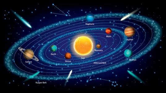 El Sol se encuentra en el centro del sistema solar y todos los planetas (con sus satélites), asteroides, meteoroides y cometas orbitan a su alrededor, es decir, giran atraídos por su fuerza gravitatoria, que actúa como un gigantesco imán, y describen órbitas elípticas en sus movimientos de traslación.