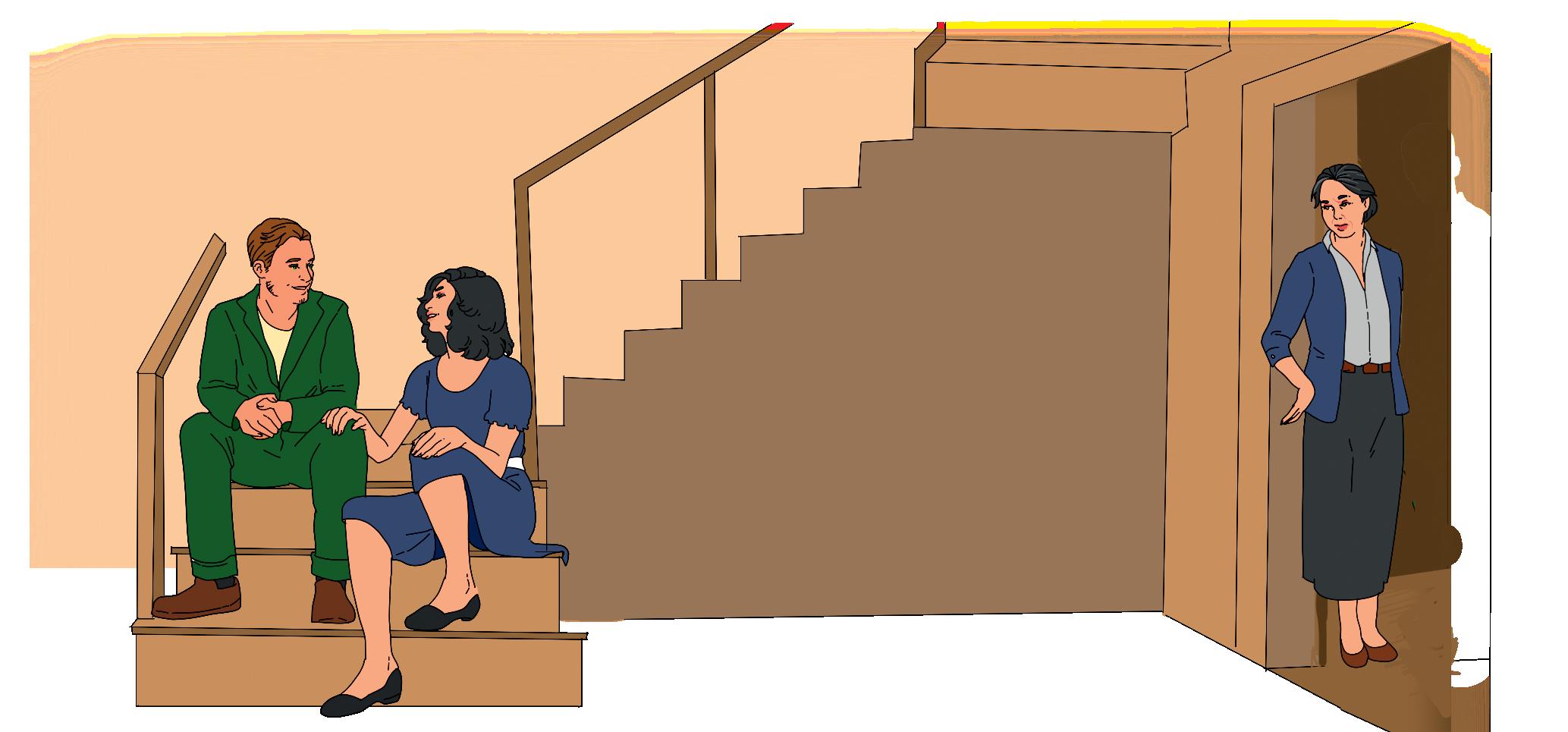 (Se contemplan extasiados, próximos a besarse. Los padres se miran y vuelven a observarlos. Se miran de nuevo, largamente. Sus miradas, cargadas de una infinita melancolía, se cruzan sobre el hueco de la escalera sin rozar el grupo ilusionado de los hijos).