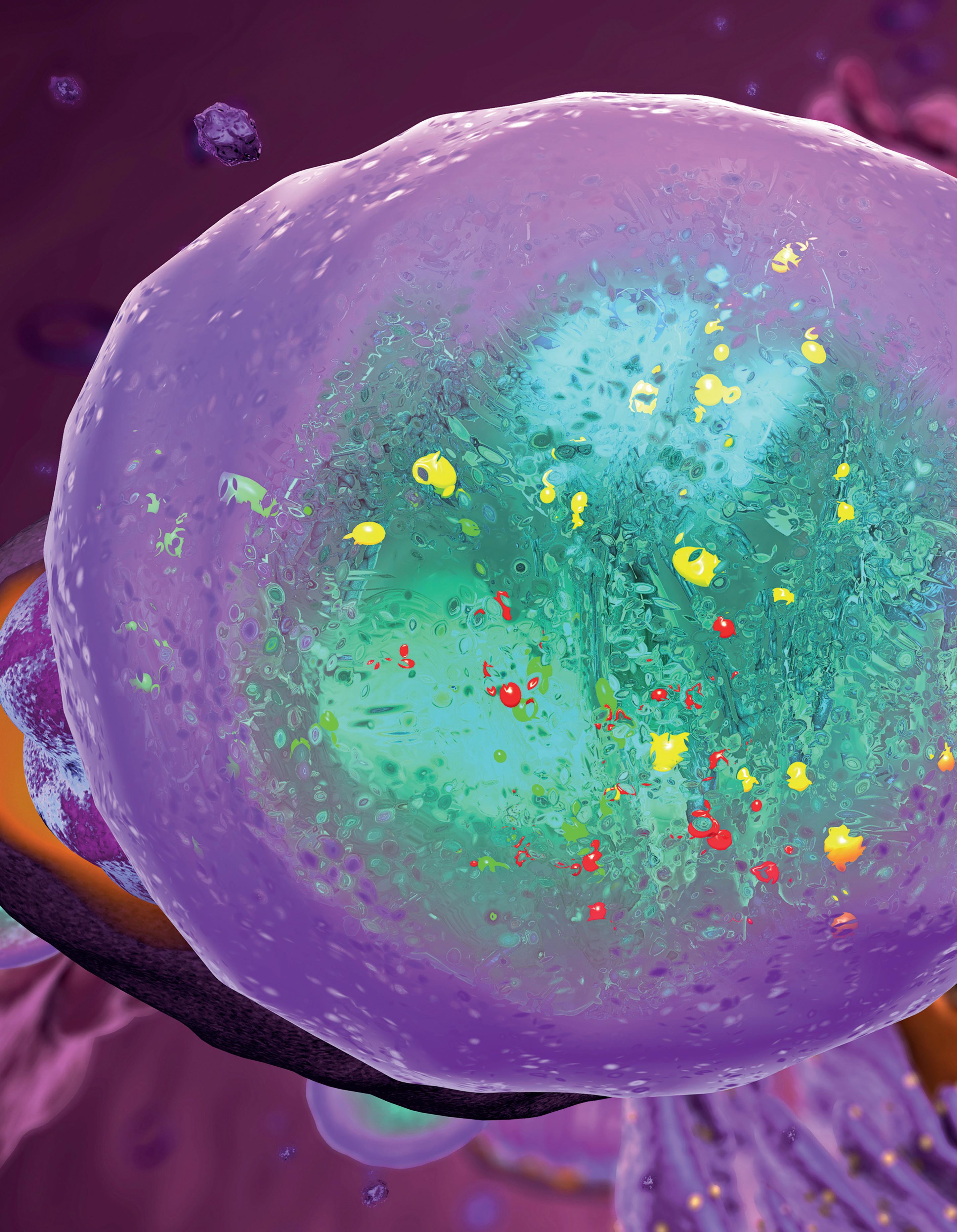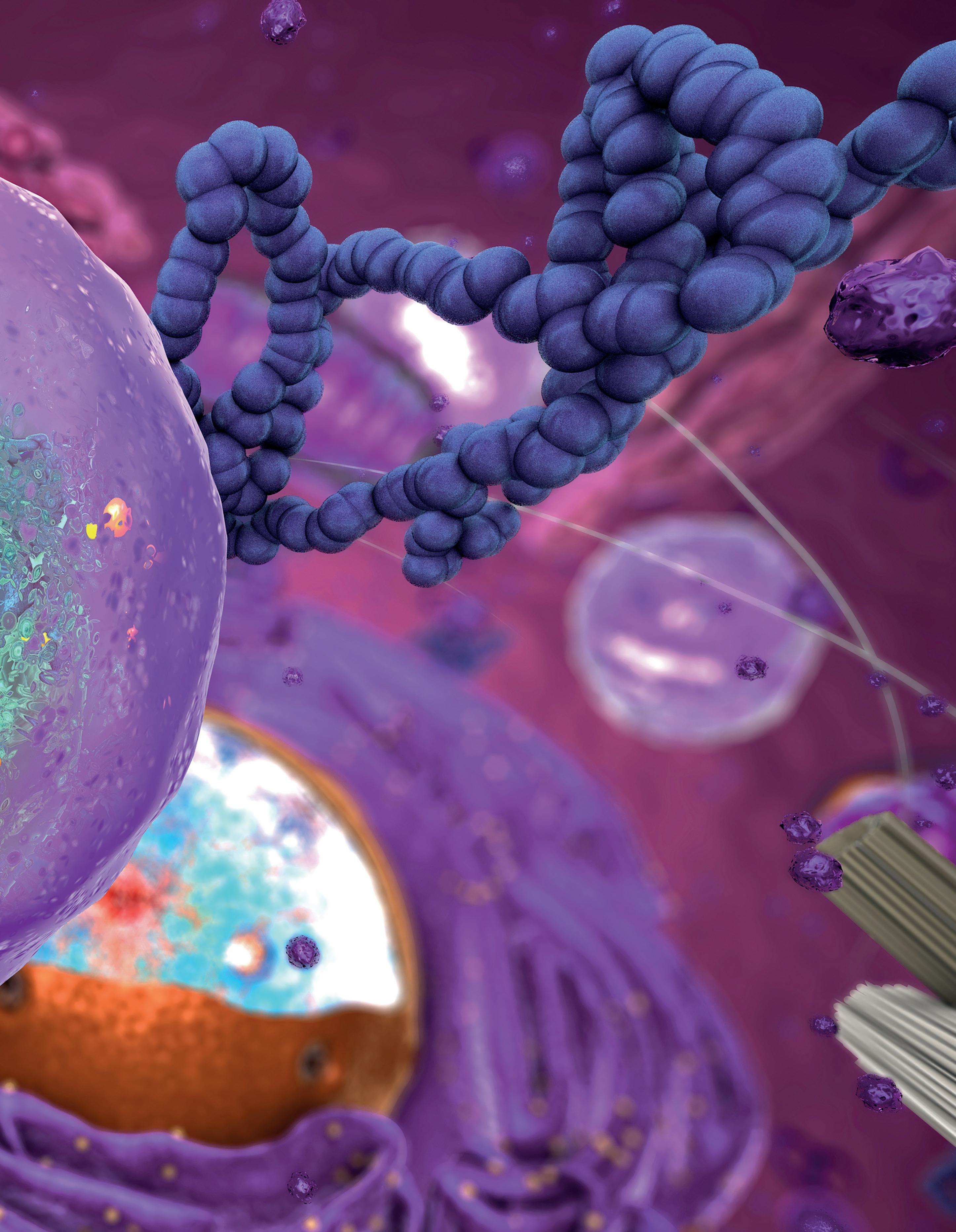 It is surrounded by a double membrane with pores, which regulates the exchange of substances. It has a nucleolus in its centre, which synthesises the ribosomes. It contains chromatin, which is made up of histones bound to DNA. During cell division, this condenses and forms chromosomes.