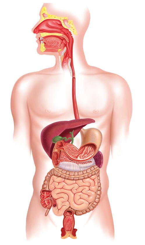 Small intestine, stomach, mouth, oesophagus, pharynx, anus, large intestine.