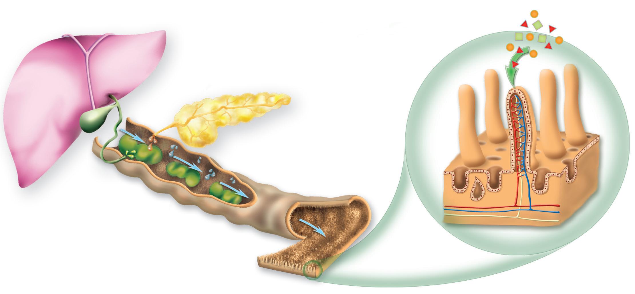 a) To increase the surface area for absorption, the inner wall of the small intestine is lined with millions of alveoli.
