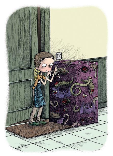 Pero lo cierto era que mi cerebro incansable ya estaba discurriendo una ocupación genial con la que entretenerme. Cuando arrancaron el coche y se marcharon, fui corriendo a la cocina y cogí el libro de recetas, dispuesto a hacer galletas francesas de praliné. Son mis favoritas. ¡Podría comerme una docena yo solo! No vayáis a pensar que mis padres son unos irresponsables que me tienen asilvestrado. Tengo totalmente prohibido trastear con el horno y con los aparatos electrodomésticos cuando no hay nadie en casa. ¡Pero es que no me pude resistir! No sé cómo explicarlo. Hay cosas que sé que no puedo hacer, pero a veces siento en mi interior más profundo una necesidad grandísima de saltarme las normas, aun a sabiendas de que si me pillan me caerá una buena. Y aquella fue una de esas ocasiones. Llamé a Dodoto para que me hiciese compañía, cogí mi delantal de monstruos y saqué los ingredientes de la despensa. En el momento justo en el que iba a mezclar la mantequilla con el azúcar, llamaron al timbre. ¡Seguro que era el mensajero que traía mi regalo! Me puse nerviosísimo. La verdad es que llevaba todo el día emocionado, con una sensación rara dándome vueltas y más vueltas en la barriga. No hubo ni tres minutos en los que aguantase sin pensar en el curso de cocina. Pero el momento de escuchar el timbre fue lo máximo. Corrí a abrir la puerta y… ¡sorpresa! Encontré una caja algo más pequeña que yo, envuelta en papel de regalo violeta decorado con gusanos, murciélagos, cucarachas