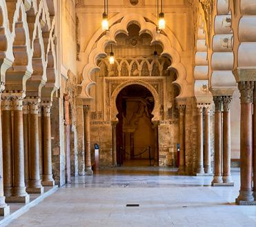 – La sala de oración es un espacio cubierto, dividido en naves por soportes y arcos. Uno de sus muros, la quibla, se orienta hacia La Meca, y se identifica porque en el centro tiene el mihrab o nicho vacío que alberga el Corán.