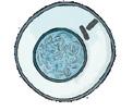1 Se produce la primera división meiótica. Se separan los cromosomas homólogos y se produce una distribución desigual del citoplasma. La célula mayor es el oocito, y la pequeña, el corpúsculo polar.