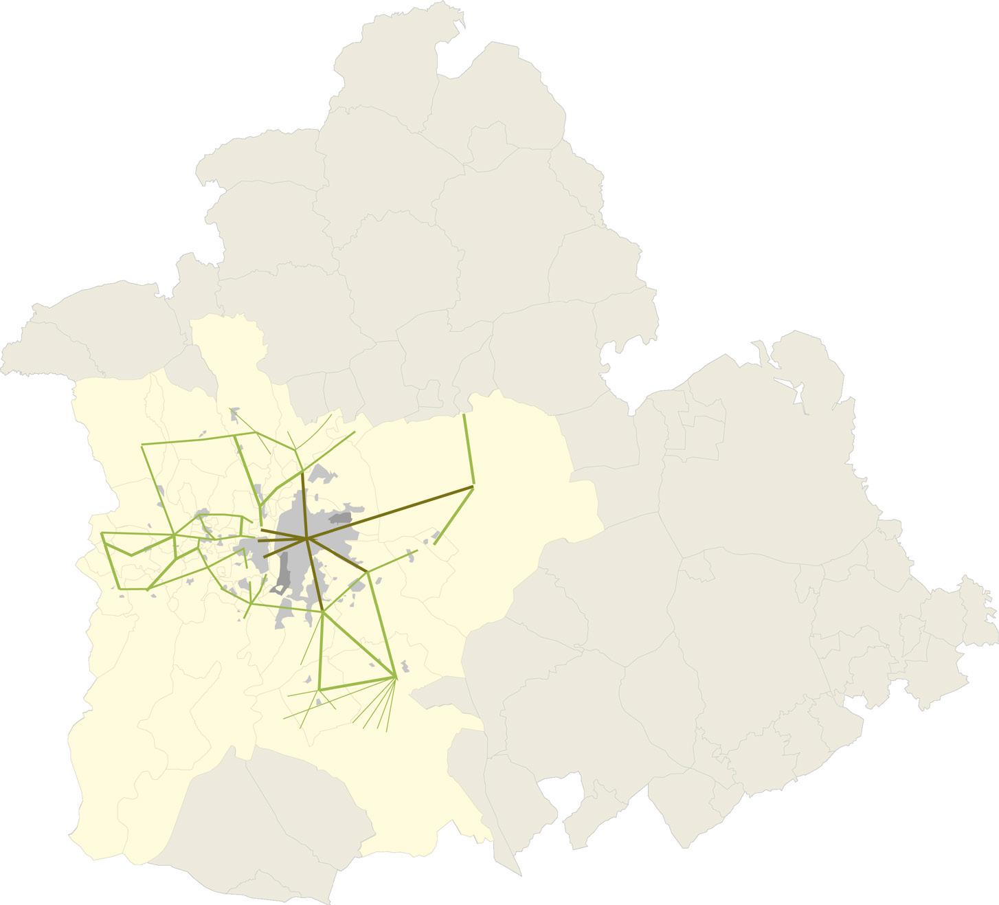 d) Las relaciones entre las ciudades del sistema urbano se han visto dificultadas por la distancia que separa a los grandes núcleos de población —unos 100 km— (excepto Valladolid y Palencia) y por el sistema radial de transporte que, hasta hace poco, ha facilitado más las relaciones con núcleos urbanos externos a la región que entre las ciudades de la Comunidad. Por su parte, la influencia de la metrópoli regional, Valladolid, solo es clara sobre las ciudades más próximas de la región: Palencia, Salamanca y Zamora, aunque tiende a extenderse.