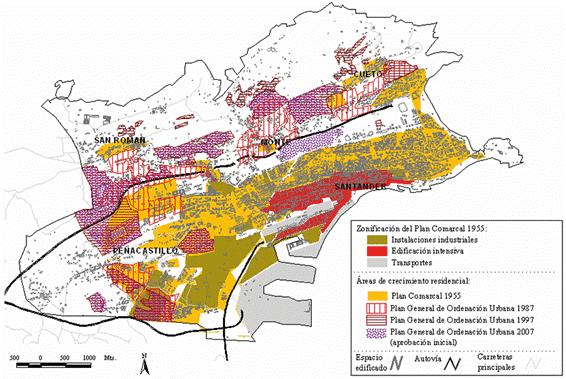 b) En la posguerra (1939-1960), la planificación se centró en tres objetivos: c) En la época del desarrollismo (1960-1975), se mantuvieron la Ley del Suelo y la zonificación urbana, pero no impidieron la aparición de numerosos problemas. En el interior de la ciudad, se eliminaron algunos edificios históricos valiosos; se crearon barrios de poca calidad, con deficiencias en equipamientos y accesibilidad; y aumentó la congestión por la excesiva altura y densidad de los edificios. En la periferia, el crecimiento en mancha de aceite, se hizo a costa de los espacios naturales.
