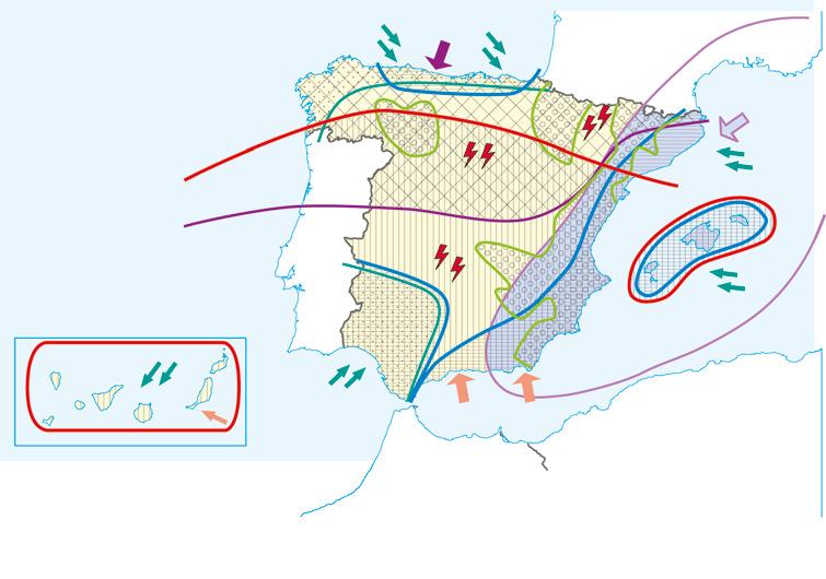 • La disposició perifèrica del relleu muntanyós entorn de la Meseta frena la influència de la mar i causa contrastos forts entre el litoral i l’interior peninsular.