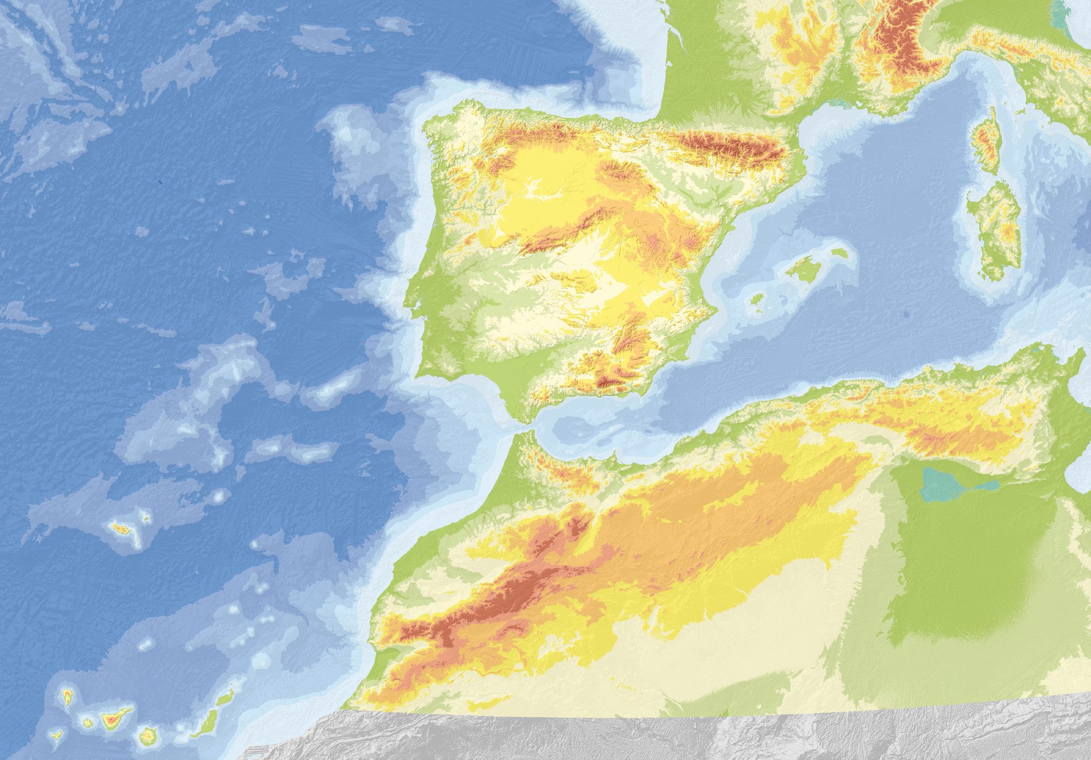 • L’elevada altitud mitjana (660 m), que a Europa només la supera Suïssa, es deu a l’existència de serralades altes i al fet que l’interior peninsular l’ocupa un altiplà elevat, situat entre els 600 i els 800 m d’altitud.