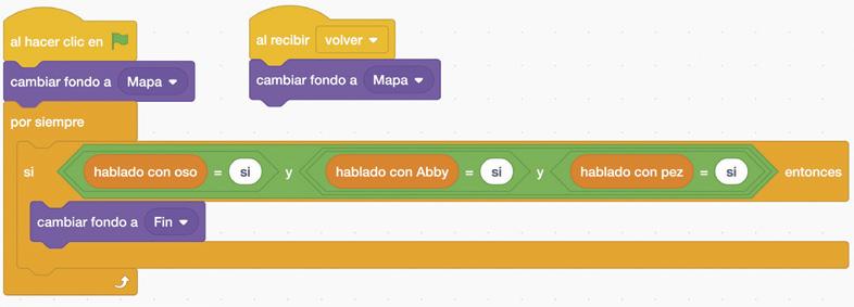 Para terminar, programamos los fondos, de manera que se muestre el mapa mientras el personaje principal no toque los objetos y cambie el fondo a Fin cuando haya interactuado con todos los personajes.