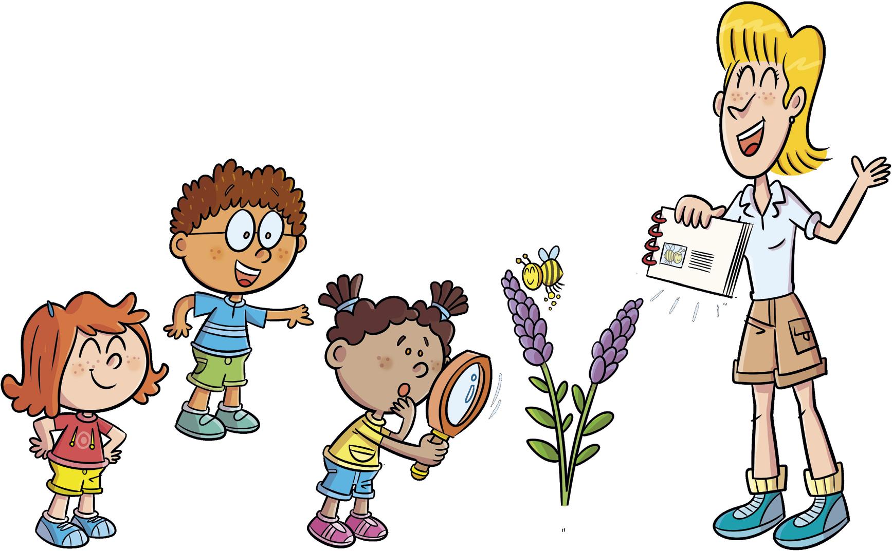 LOS NIÑOS Y LAS NIÑAS HAN VISTO UNA ABEJA EN LAS LAVANDAS Y CREÍAN QUE SE ESTABA COMIENDO LA PLANTA. SU PROFE LES HA ENSEÑADO UN CUADERNO DE CAMPO CON INFORMACIÓN SOBRE LAS ABEJAS.