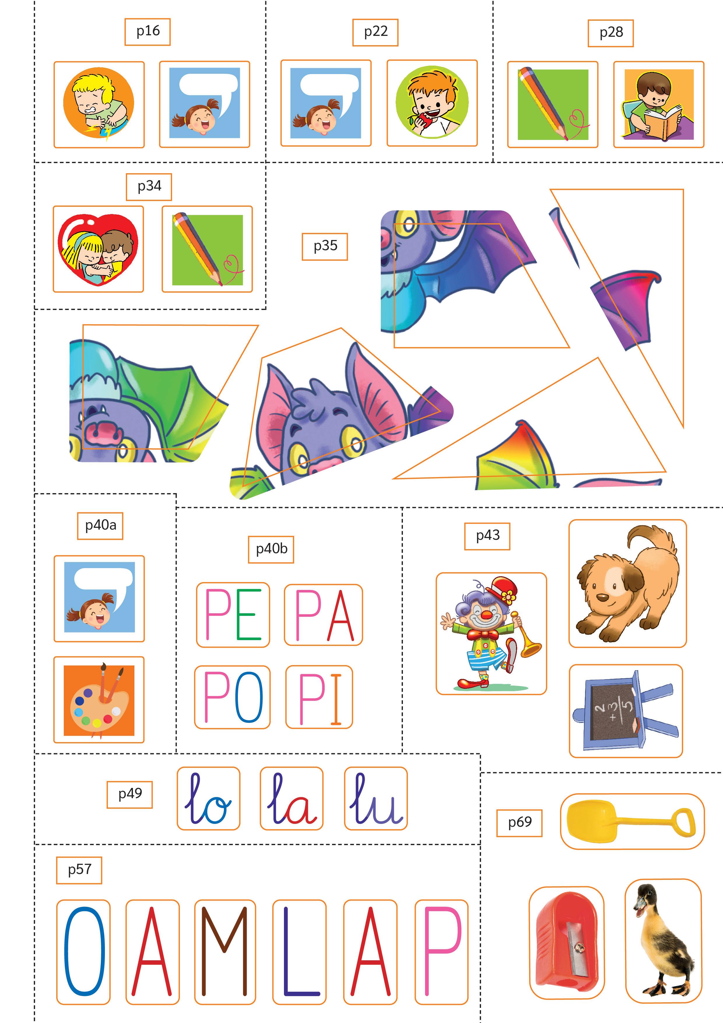 ➜ Pega los adhesivos de las sílabas en mayúscula por la que empieza cada palabra en los lugares que correspondan.