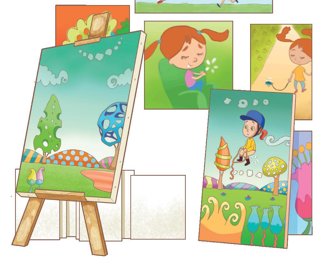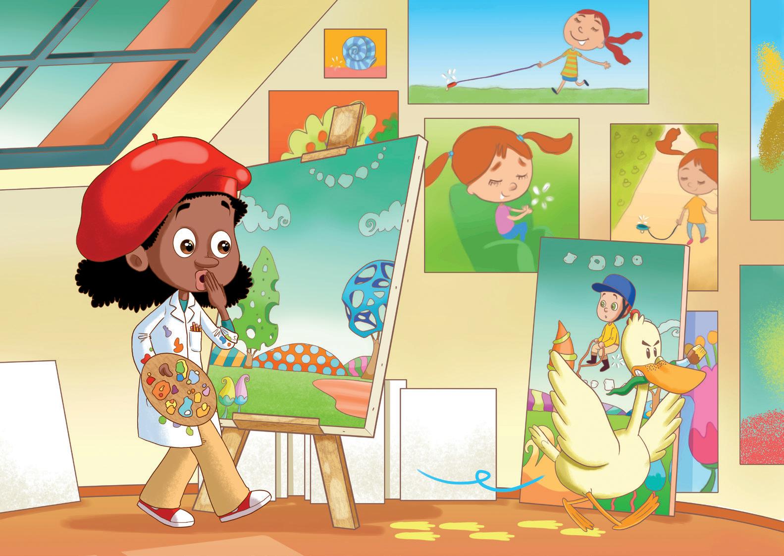 1. Había una vez, en Letrón, una niña pintora llamada Paula. Se ponía su bata, preparaba los pinceles, las pinturas, la paleta... ¡Y a pintar sin parar! Sus dibujos eran preciosos. Además, tenía un pincel especial que volvía real lo que se pintaba con él: “¡Pincel, pincelito, pintemos un precioso patito!”, dijo Paula. Dio unas pinceladas, y un pato muy patoso caminó por la pintura diciendo: “¡Cua, cua! ¡Pico, pico!”.