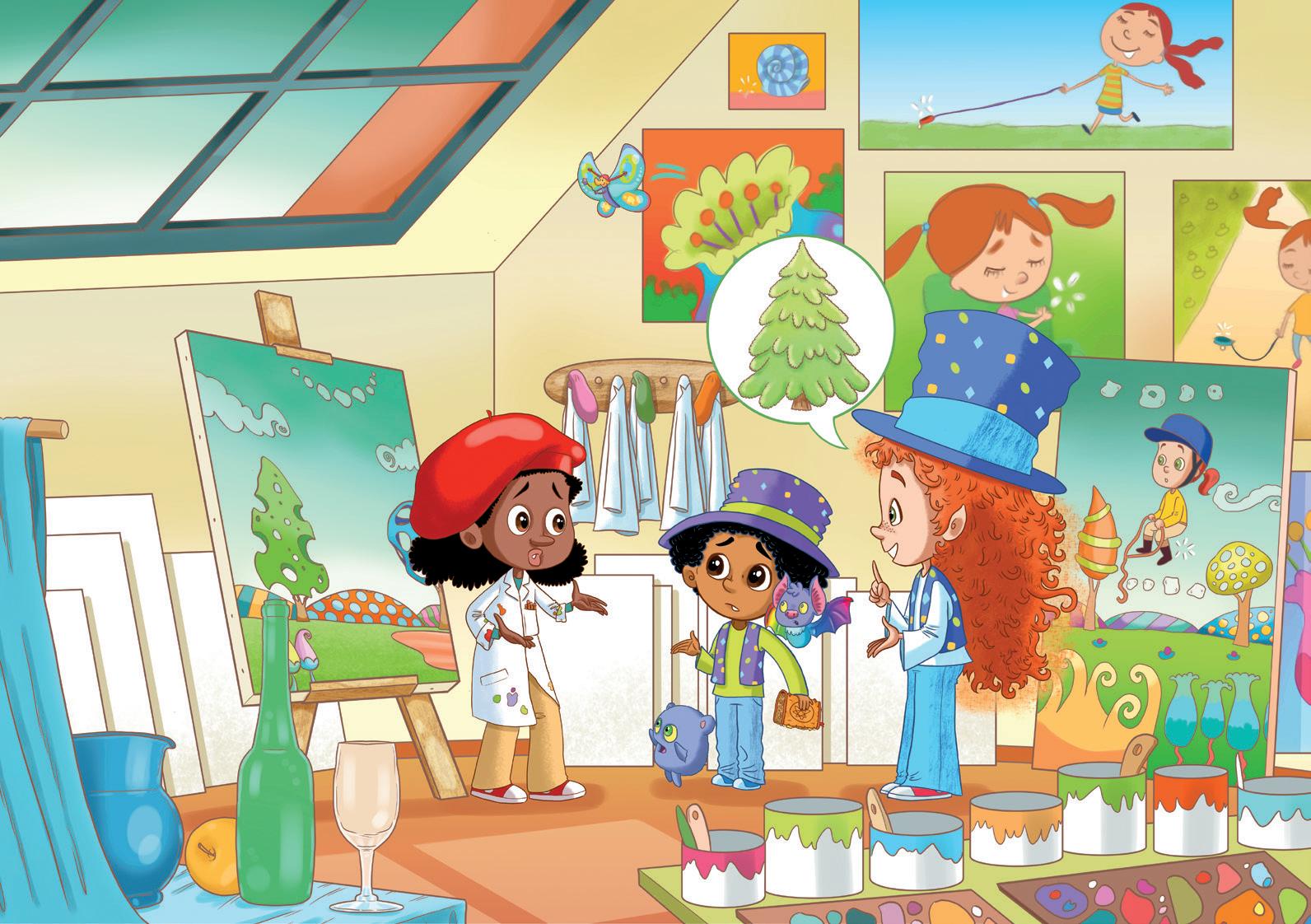 3. Entonces, pidió ayuda a la maga Leo: “¡MAGA LEO, NO TE VEO! ¡MAGA LEO, NO TE VEO!”. Enseguida aparecieron Leo, Letrín, Alfi y Murfi: “Si me llama una pintora, aparezco justo ahora. Aquí estoy con mis amigos, ¡te ayudaremos unidos!”, dijo Leo. La maga tuvo una idea: “Necesitamos una letra P muy especial de un pino pequeño. Y encontrar a Pecas, claro”.