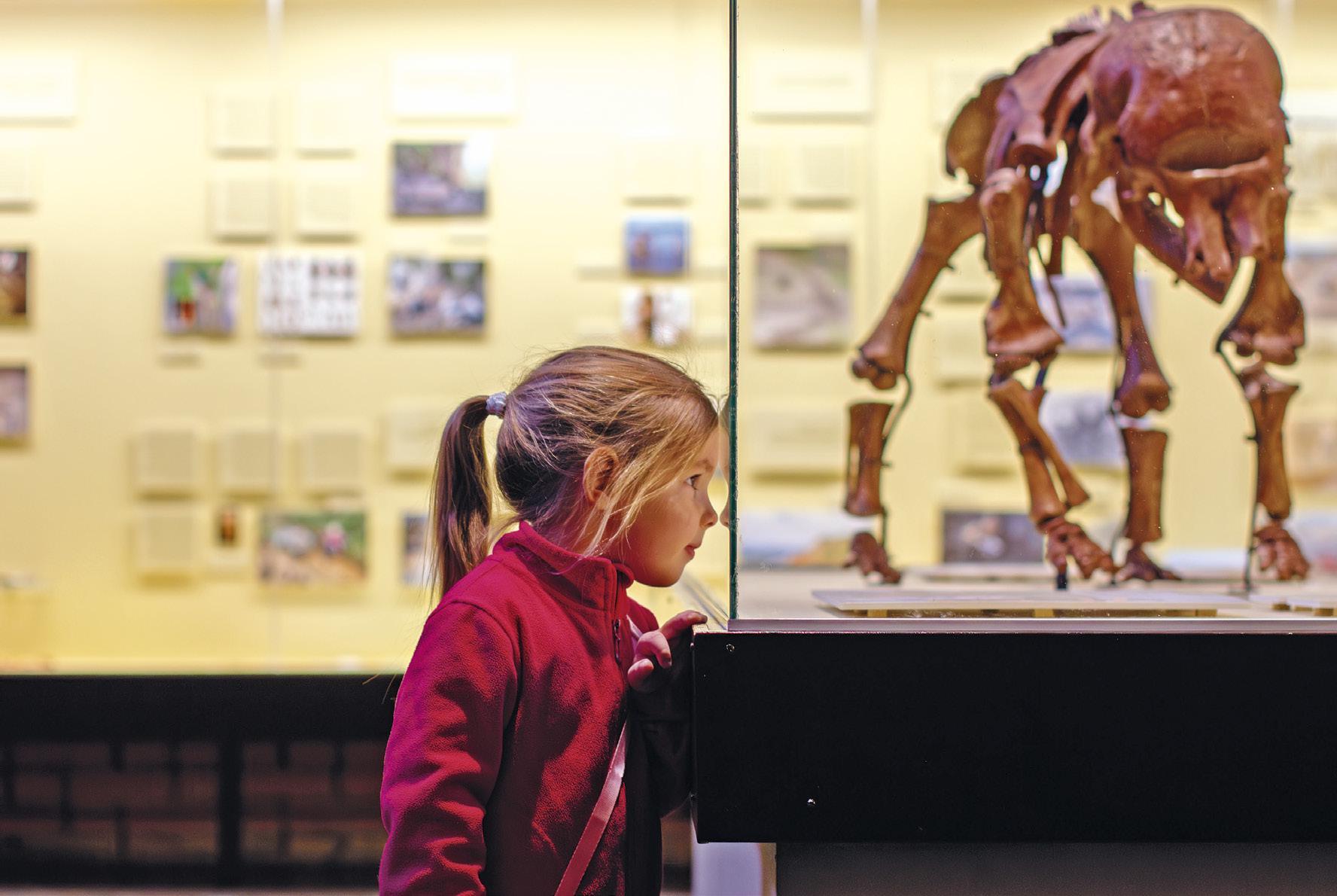 • En la página anterior, observa la escena. Rodea al niño que ha encontrado en su álbum de cromos el mismo dinosaurio que están viendo en el museo.