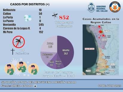 En el último reporte de la sala situacional de la Dirección Regional de Salud (Diresa) del Callao, que data del sábado 1 de julio, Ventanilla registró 595 casos acumulativos de dengue.En comparación con el informe del 28 de junio, aumentaron en 35 las infecciones de este virus tropical en todo el distrito. Por otro lado, Mi Perú es la segunda jurisdicción que presenta más casos de dengue: 192.Mientras que, en toda la región del Callao, Cercado es el tercero, con 50 casos acumulativos. Luego le siguen Bellavista (10), Carmen de la Legua Reynoso (4), La Perla (1). En suma, se vienen registrando 852 personas infectadas. Por último, el grupo etario más vulnerable son los adultos, con 362 casos. Después están los jóvenes (215), adolescentes (119), niños (83), adultos mayores (73).