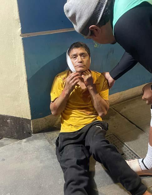 Un hombre de aproximadamente 50 años, en aparente estado de ebriedad, sufrió una aparatosa caída que terminó con su cabeza golpeando violentamente el suelo. La sangre quedó como prueba irrefutable sobre la vereda, apenas disimulada por una prenda de vestir que algún buen samaritano colocó para cubrirla. La escena era inquietante. El hombre yacía sentado, desorientado, con el rostro desencajado y un polo manchado de sangre. Algunos trabajadores de la zona intentaron moverlo hacia la vereda de la avenida principal, pensando que así sería más fácil que una ambulancia lo recogiera.