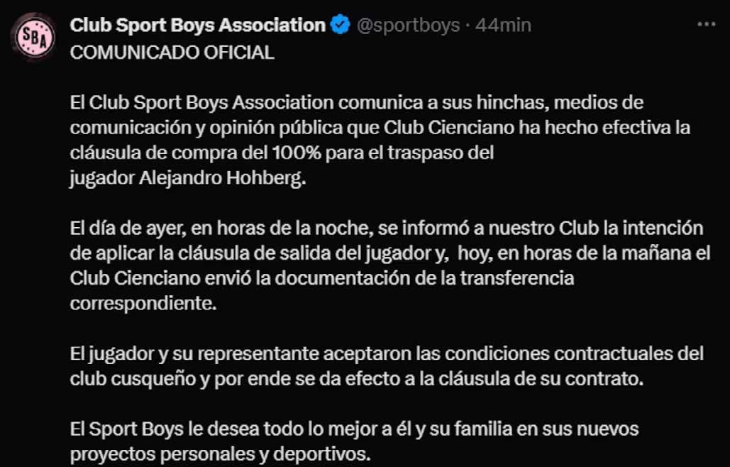 Sport Boys confirmó la noticia a través de un comunicado oficial: la noche anterior recibieron la notificación del cuadro cusqueño y por la mañana se formalizó el trámite. Así, se cerró una etapa importante para el club del Callao,