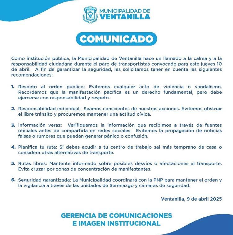 Ante el paro de transportistas convocado para este jueves 10 de abril, la Municipalidad de Ventanilla hizo un llamado a la calma y a mantener el orden público.