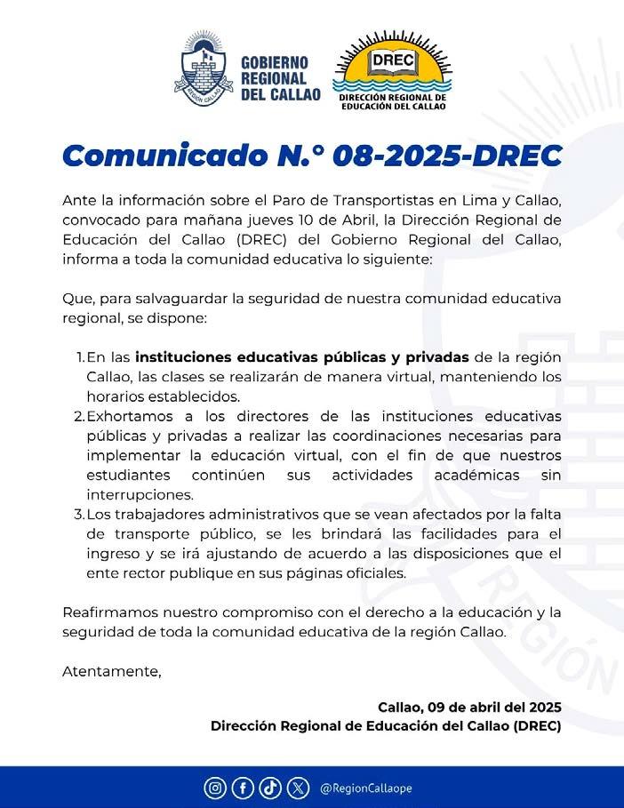 La Dirección Regional de Educación del Callao (DREC) anunció que todos los colegios, públicos y privados, hagan clases virtuales hoy debido al paro para “salvaguardar la seguridad de estudiantes, docentes y personal administrativo” según dieron comunicado.