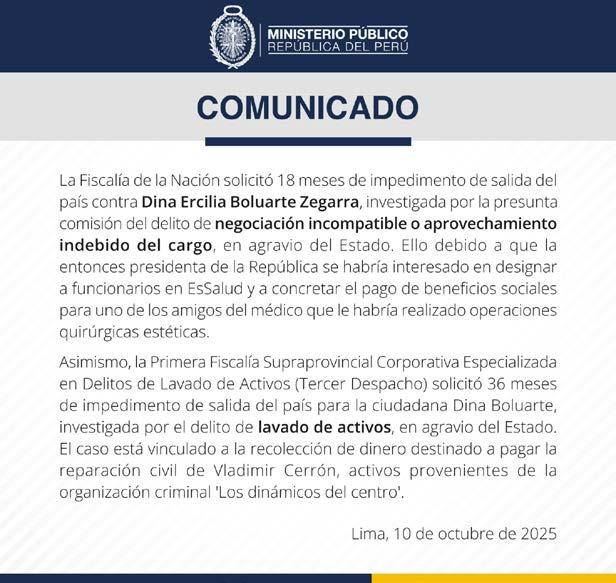 El Ministerio Público solicitó al Poder Judicial que se imponga impedimento de salida del país por 36 y 18 meses contra la expresidenta Dina Ercilia Boluarte Zegarra, investigada por los presuntos delitos de lavado de activos y negociación incompatible, en agravio del Estado. La medida busca garantizar su permanencia en el país mientras avanzan los procesos judiciales y evitar un eventual riesgo de fuga. Según el comunicado oficial, la Primera fiscalía Supraprovincial Corpora-