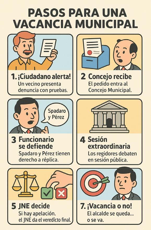 La vacancia del alcalde Pedro Spadaro y del primer regidor César Pérez no es automática, sino que debe seguir el procedimiento legal establecido en la Ley orgánica de Municipalidades. El Concejo del Callao deberá analizar si la contratación de dos personas vinculadas jurídicamente a ambos funcionarios configura alguna causal de vacancia del