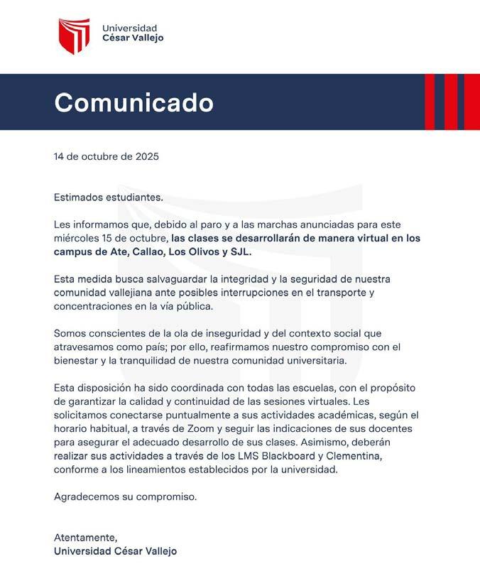 llejo (UCV), a través de un comunicado, informó que las clases se desarrollarán de manera virtual “para salvaguardar la integridad de la comunidad vallejiana”, ante las marchas que podrían afectar el tránsito a nivel nacional.