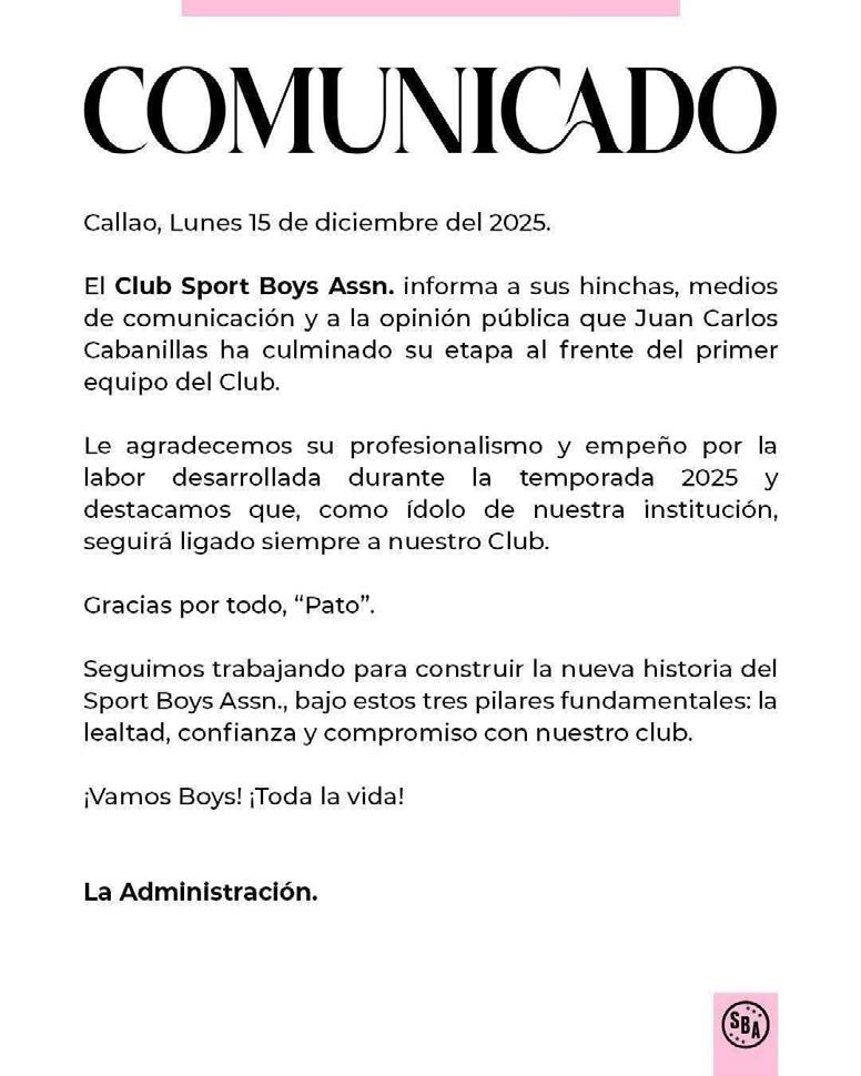 El Club Sport Boys Association confirmó la salida de Juan Carlos Cabanillas de la dirección técnica del primer equipo. A través de un comunicado oficial difundido este lunes 15 de diciembre, la institución chalaca informó que el entrenador dio por concluida su etapa al frente del plantel profesional tras culminar la temporada 2025.