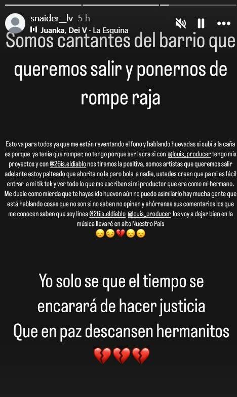 peto ante las especulaciones. “Hay mucha gente que está hablando cosas que no son. Si no saben, no opinen. Nosotros solo hacíamos música”, expresó. Tanto 26IS como Louis Producer eran cercanos al también fallecido cantan -