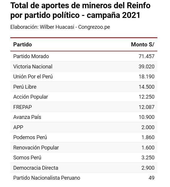 Más de 190 mil soles provenientes de mineros inscritos en el Reinfo ingresaron a la campaña electoral del 2021. La mayoría de estos aportes fueron entregados en efectivo a 28 candidatos de trece partidos políticos. Cuatro de ellos fueron elegidos y hoy integran el Congreso: Lady Camones (APP),