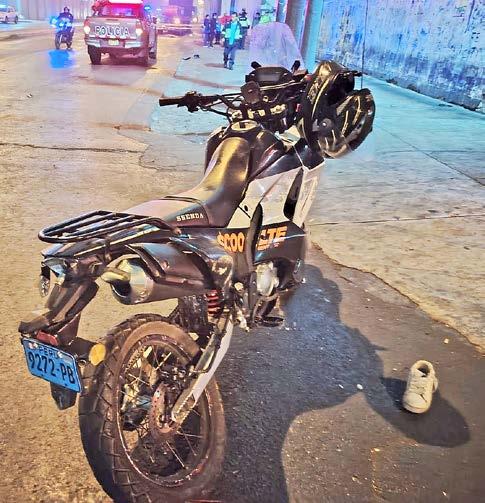 La unidad menor quedó en el pavimento con la llanta trasera desplazada, evidencia del fuerte impacto sufrido.