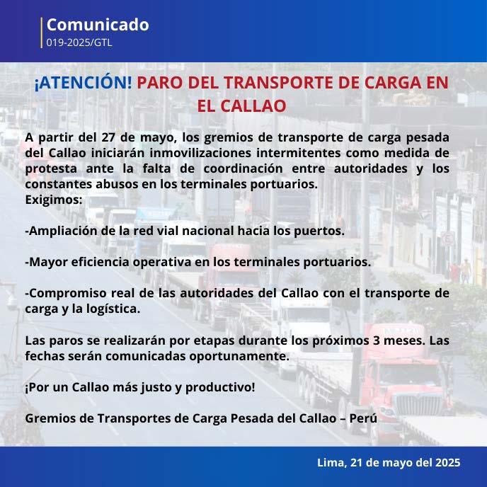 Los gremios de transporte de carga pesada del Callao anunciaron este jueves 22 de mayo que iniciarán inmovilizaciones intermitentes a partir del 27 de mayo, como medida de protesta frente a lo que consideran una grave falta de coordinación entre las autoridades y reiterados abusos en los terminales portuarios.