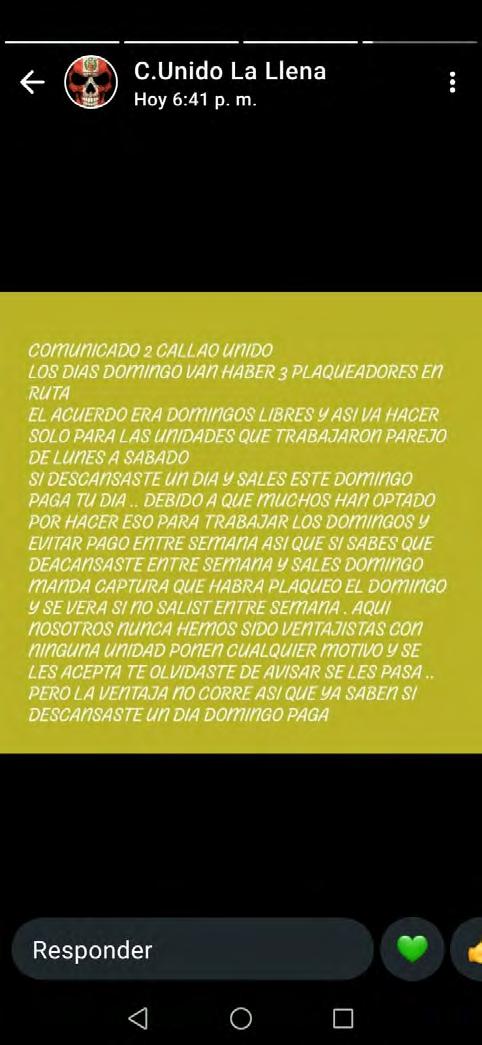 En uno de los estados difundidos, se anuncia que habrá tres plaqueadores operando los domingos y que solo estarán exoneradas de cobros las unidades que “trabajaron parejo toda la semana”. En cambio, quienes descansaron un día y decidan trabajar este domingo deberán pagar. El mensaje también acusa a los conductores de supuestamente evitar los pagos entre semana para salir únicamente los domingos, por lo que ahora se les exige enviar capturas que prueben si realmente descansaron.