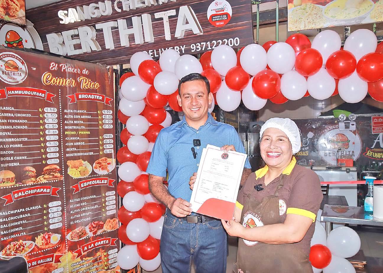 El alcalde del distrito de Mi Perú, Irvin Chávez, encabezó la inauguración de la “Sanguchería Berthita”, ubicada en la Av. Huaura, y entregó la licencia de funcionamiento a su propietaria, Bertha Espinoza.