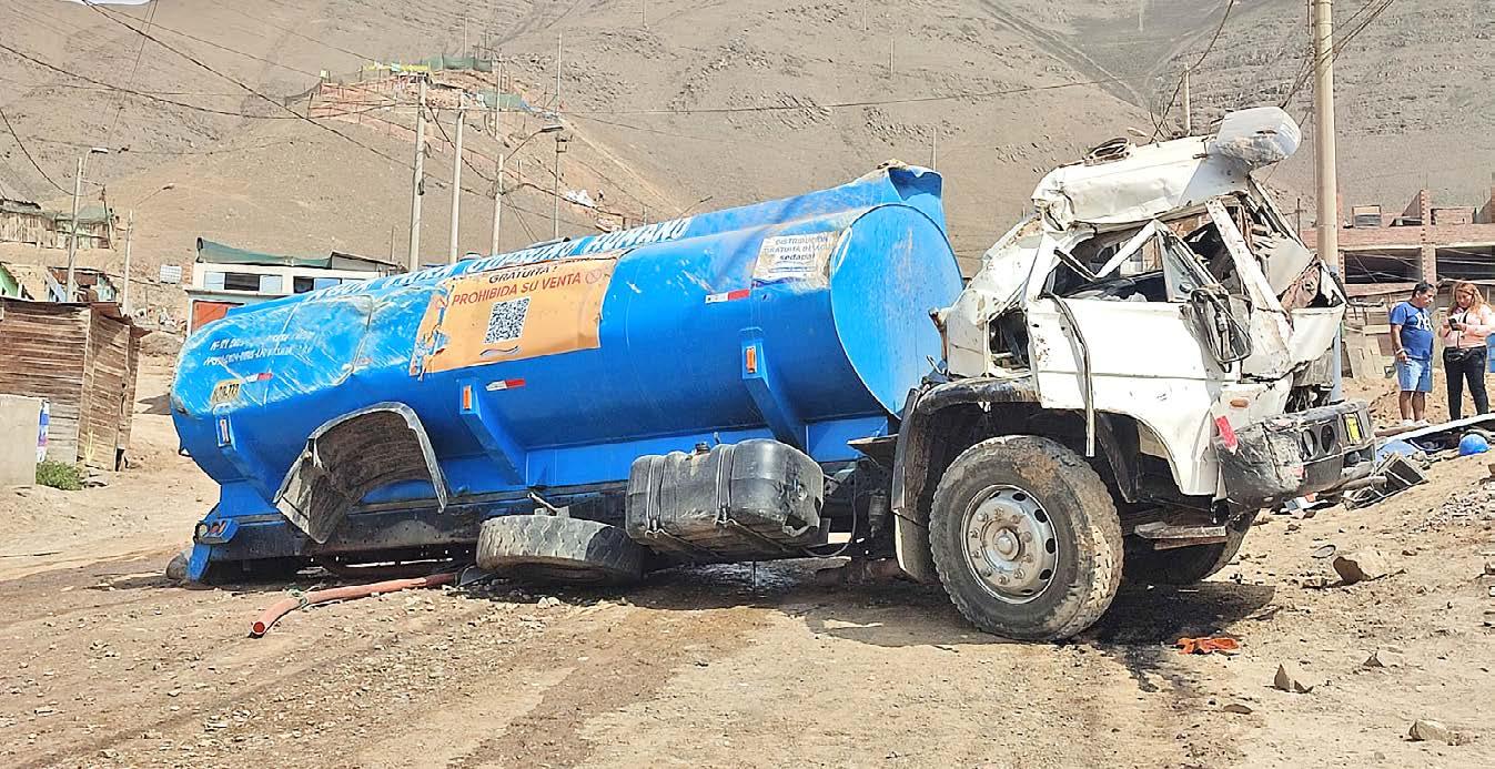 Un aparatoso accidente de tránsito se registró la tarde del miércoles 24 de septiembre en el asentamiento humano Las Lomas de Ventanilla Alta, donde un camión cisterna de agua potable volcó tras perder el control y terminó con partes de la unidad incrustadas en la pared de una vivienda.