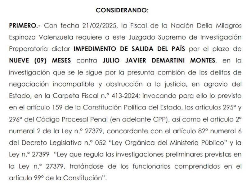 Delia Espinoza, solicitó al Poder Judicial el impedimento de salida del país para el exministro de Desarrollo e Inclusión Social, Julio Demartini. Esta medida se hace en el marco de las investigaciones preliminares que se le acusan por el caso Qali Warma,