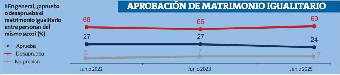 Una reciente encuesta nacional de Ipsos revela una tendencia preocupante: la mayoría de peruanos desaprueba derechos fundamentales para esta población. En el 2025 un 69% se opone al matrimonio igualitario (3% más que en 2023), y un 67% cree que las personas del mismo sexo no deberían tener derecho a adoptar niños. Solo un 24% aprueba el matrimonio igualitario, mientras que el 27% está a favor de la adopción.