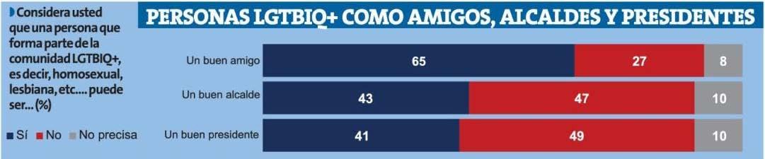 Los datos también muestran una percepción social dividida. Un 65% de encuestados cree que una persona LGTBIQ+ puede ser un buen amigo, pero casi la mitad duda de su capacidad para ejercer liderazgo: el 47% considera que no puede ser un buen alcalde y el 49% que no puede ser un buen presidente.