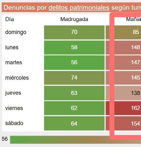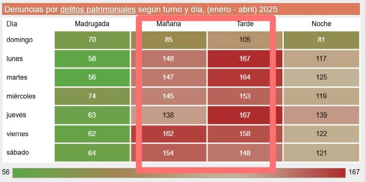 En segundo lugar, la mañana figura también como una franja horaria con cifras preocupantes, especialmente los viernes con 162 denuncias y los sábados con 154. Estos días coinciden con actividades de mayor movilidad como compras semanales, operaciones bancarias y cobros, lo que podría convertir a las personas en blanco de los delincuentes.