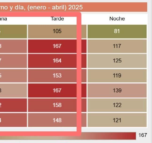 Las cifras indican que el turno tarde —de domingo a sábado— concentra el mayor número de denuncias por robo y hurto. Algunos de los picos más altos se registran los lunes con 167 denuncias, los martes con 164, los jueves con 167 y los viernes con 158. En este grupo, llama la atención que el lunes y jueves comparten la cifra más alta de casos, lo que podría estar relacionado con los flujos de personas en centros comerciales, transporte público y zonas residenciales al inicio y a mitad de la semana.