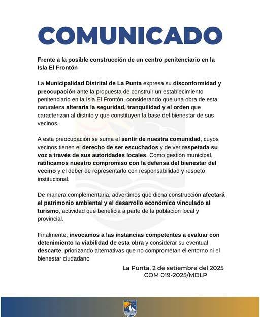 La comuna distrital difundió un mensaje que no dejó dudas: “El bienestar de los punteños no es negociable”. En el mismo documento se subraya que la defensa del distrito será firme: “Nuestro deber es representarlos con responsabilidad y respeto institucional. No permitiremos que se ponga en riesgo la tranquilidad de nuestras calles ni el desarrollo económico ligado al turismo”. El Ejecutivo, sin embargo, ya ha puesto fecha y presupuesto. Según el ministro de Justicia, Juan José Santibáñez, la obra contará con S/ 500 millones de inversión y está pensada para recibir a 2,000 reclusos de alta peligrosidad: sicarios, asesinos y extorsionadores. El plan busca ser una respuesta a la sobrepoblación penitenciaria, que hoy supera el 150 % a nivel nacional.