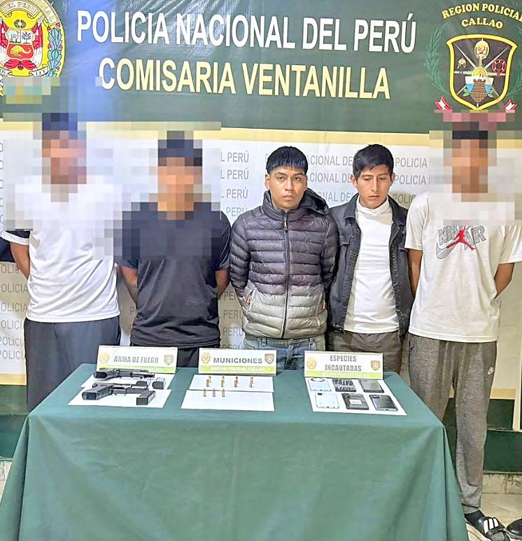 por efectivos de la Comisaría de Ventanilla en coordinación con la División Regional de Inteligencia. Los detenidos fueron identificados como Braulio Minaya Estela (21), alias “Quijada”; Héctor Escobal Noreña (23), alias “Flaco”; y tres menores de edad conocidos como “Adri” (17), “Chato” (16) y “Nero” (16). Durante el operativo, se hallaron en poder de los intervenidos dos armas de fuego: una pistola marca Sarsilmaz con dos cacerinas abastecidas con ocho