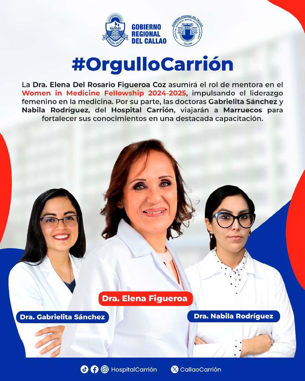 La médica Elena Figueroa Coz, directora del Hospital Nacional Carrión, del Callao, ha sido reconocida por la organización no gubernamental Operación Sonrisa, con sede en Estados Unidos, para ser mentora de su programa internacional Women in Medicine Fellowship 20242025, que impulsa el desarrollo de mujeres de diferentes países en la medicina. Además, otras dos médicas del mismo nosocomio, Gabrielita Sánchez Horna y Nabila Rodríguez Ahomed, han sido seleccionadas para participar en esta misma iniciativa: recibirán capacitación y mentoría para fortalecer su crecimiento académico y profesional. Figueroa es una destacada profesional médica especializada en ginecología y obstetricia, titulada en la Universidad Nacional Federico Villarreal, con maestría de la Universidad de Barcelona. En enero de 2023, fue designada como directora del Hospital Carrión por el Gobierno Regional del Callao, cargo que ya había ocupado en 2001. También ha sido em el Carrión jefa de Ginecología y Obstetricia del Carrión y directora adjunta de Producción y Servicios de Salud. En el año 2021, fue directora del Hospital de Rehabilitación del Callao.