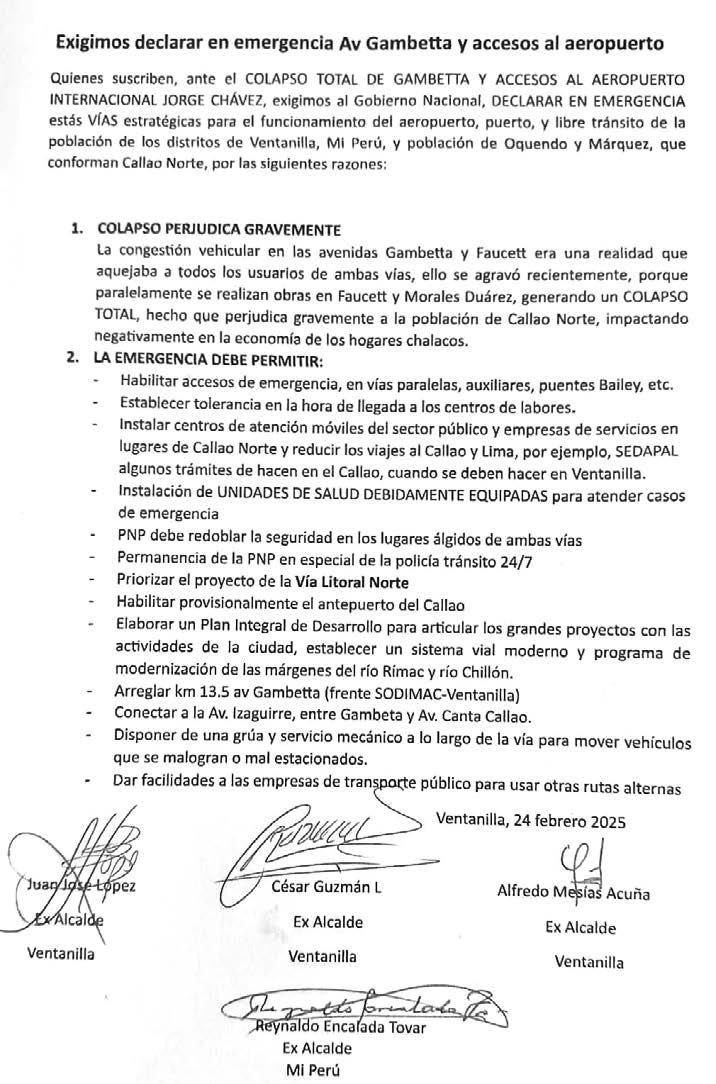 Exalcaldes de Ventanilla Juan José López, César Guzmán y Alfredo Mesías se unieron para exigir al Gobierno la declaratoria de emergencia de la avenida Gambetta y los accesos al Aeropuerto Internacional Jorge Chávez. Las autoridades ediles sostienen su solicitud en el “colapso total’’ de las vías estratégicas que se habrían visto afectadas por las obras en la av. Faucett y Morales Duárez, lo cual estaría impactando negativamente en la economía de los hogares chalacos. Asimismo, subrayaron que la declaratoria contemple diversos ejes, como la habilitación de vías auxiliares, puentes Bailey, entre otros que permitan el rápido transporte de conductores.