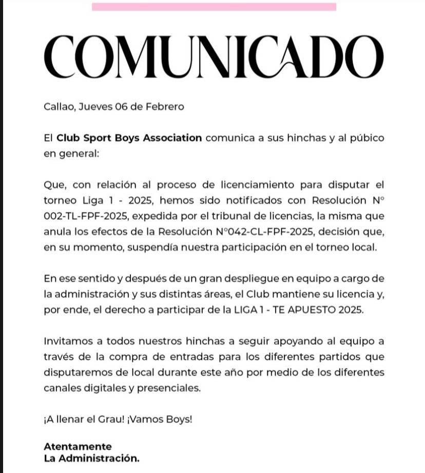 Buenas noticias para los hinchas del Sport Boys. El club rosado anunció a través de un comunicado oficial que ha recuperado su licencia para participar en la Liga 1 - Te Apuesto 2025, tras la decisión del Tribunal de Licencias de la Federación Peruana de Fútbol (FPF) de anular la resolución que suspendía su participación en el torneo. El club detalló que la Resolución N°002-TLFPF-2025 dejó sin efecto la sanción impuesta con la Resolución N°042-CL-FPF-2025, la cual había puesto en peligro su presencia en la máxima categoría del fútbol peruano. Con esta nueva resolución, Sport Boys podrá disputar la próxima temporada con total normalidad.