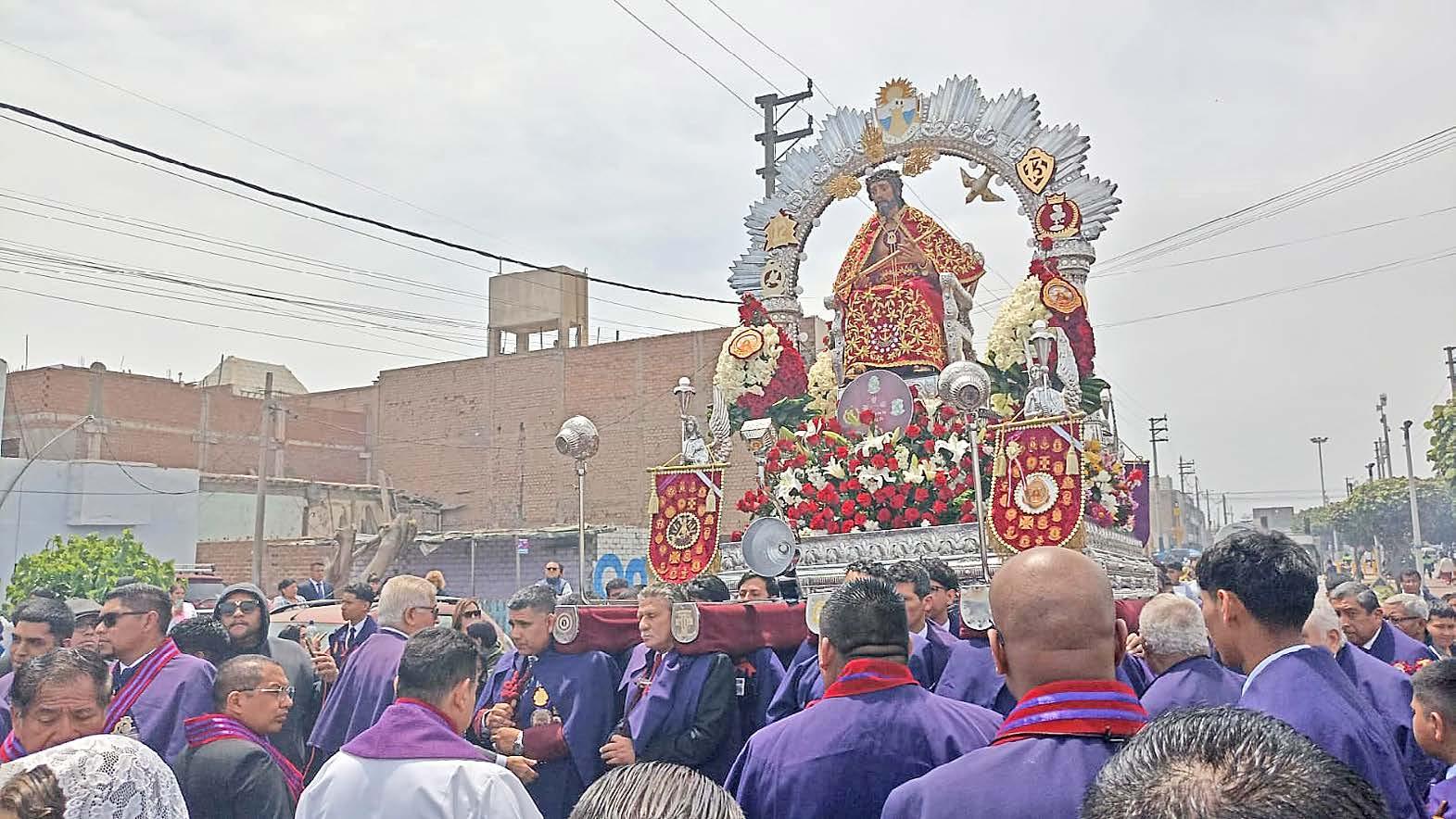 El recorrido se inició a media tarde, cuando las campanas de la iglesia anunciaron que el Señor del Mar volvería a caminar junto a su pueblo. En medio de un cielo despejado y el aroma del incienso, los cargadores de la Hermandad de Culto, Cargadores y Sahumadoras del Señor del Mar levantaron en hombros la imagen sagrada entre aplausos y vítores. “¡Viva el Señor del Mar!”, gritaban los fieles mientras sonaban las bandas y estallaban los fuegos artificiales que iluminaron la cuadra de la parroquia Santa Rosa. El recorrido siguió por la avenida Marco Polo, continuó por el jirón Alberto Secada, el jirón Guisse y la avenida Sáenz Peña, hasta llegar al jirón Washington y luego al jirón Colón, para finalmente retornar al punto de partida. Cada cuadra se transformó en un altar improvisado, donde familias enteras esperaban con flores, globos y pañuelos en alto. Algunos vecinos sacaron imágenes religiosas a las puertas de sus casas, mientras los más pequeños lanzaban pétalos al paso del Señor.