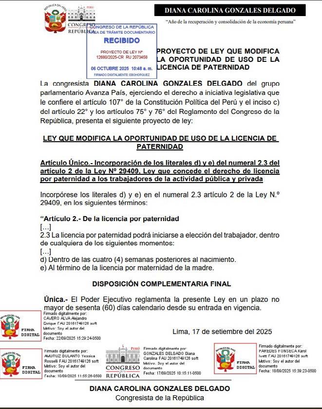 do, de Avanza País, quien planteó que el permiso pueda utilizarse en dos momentos: dentro de las cuatro semanas posteriores al nacimiento o al término de la licencia por maternidad de la madre. El Proyecto de Ley N.º 12680/2025-CR, registrado el 6 de octubre, incorpora