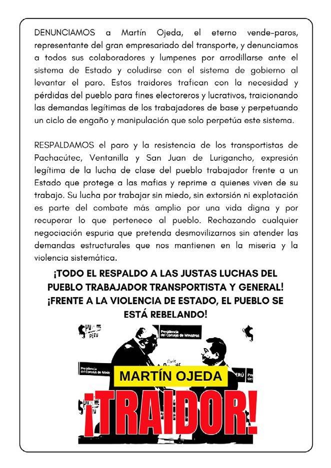 En su comunicado, el colectivo acusa al Estado de ser “el principal promotor de la delincuencia y la informalidad”, y de mantener una “violencia paramilitar y policial contra el pueblo”. También denuncian la “represión sistemática” del Gobierno y la complicidad con el narcotráfico y las mafias que operan con impunidad. Su respaldo al paro de los transportistas de Ventanilla, Pachacútec y San Juan de Lurigancho