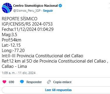La madrugada de este miércoles 11 de diciembre ocurrió un sismo de escala 3.5, según comunicó el Instituto Geofísico del Perú (IGP), ocurrido a la 1:00 a.m., aproximadamente. El epicentro fue a 12 kilómetros al suroeste del Callao, con profundidad de 54 kilómetros.