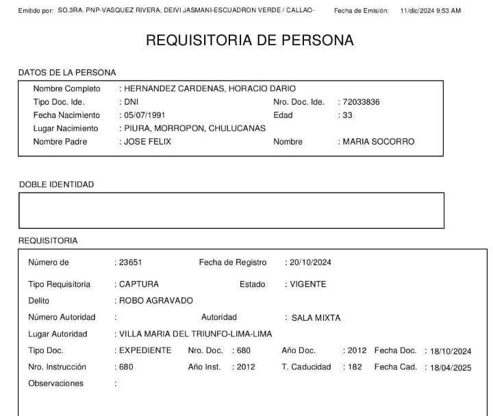 Al verificar sus datos a través del sistema Esinpol, se confirmó que Hernández Cárdenas tenía una orden de arresto pendiente por el delito de robo agravado, emitida por la Sala Mixta de la Fiscalía de Villa María del Triunfo.