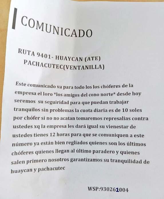 “Este comunicado va para todos los chóferes de la empresa El Loro. ‘Los Amigos del Cono Norte’ desde hoy seremos su seguridad para que puedan trabajar tranquilos sin problemas. La cuota diaria es de 10 soles por chófer, si no acatan tomaremos represalias contra ustedes porque la empresa les dará igual su bienestar”, se lee en el papel que obtuvo la central de noticias de Prensa Chalaca.